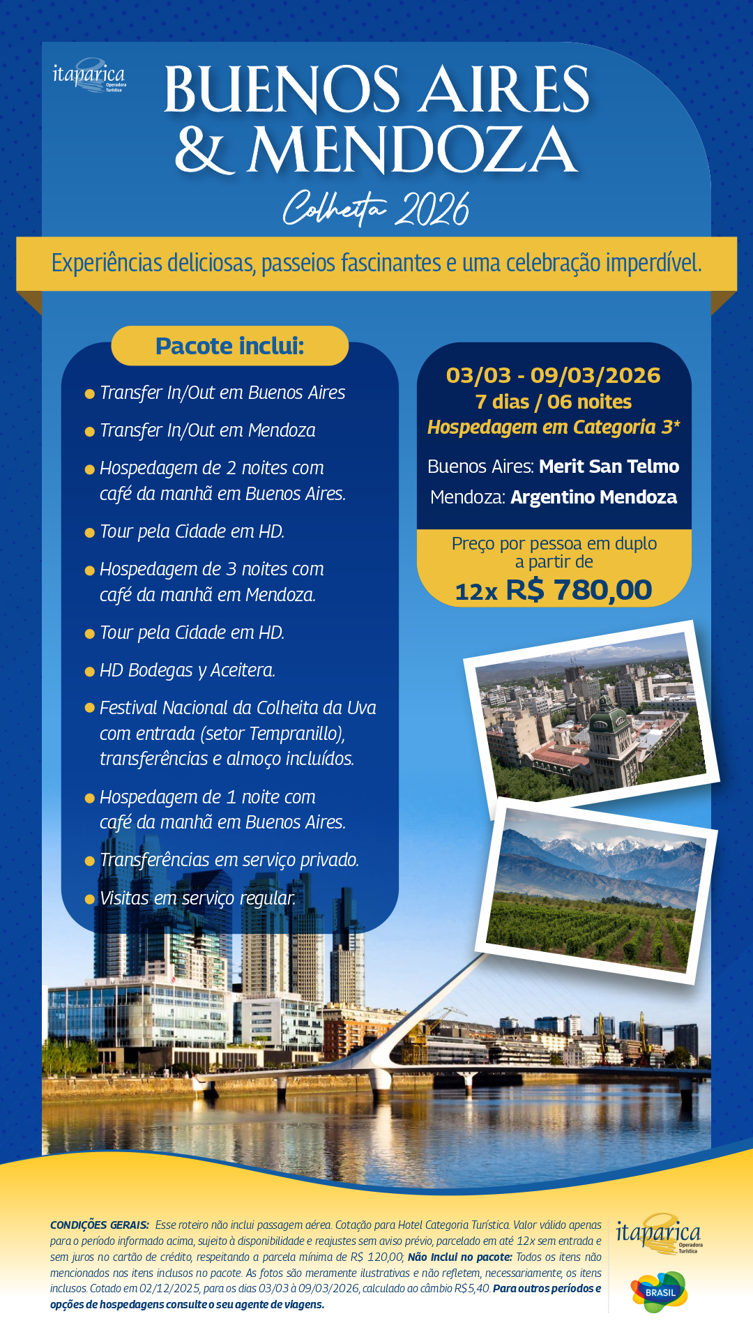 Entre o ritmo elegante de Buenos Aires e a atmosfera acolhedora de Mendoza, o roteiro revela paisagens, sabores e histórias que convidam a aproveitar cada instante. Hospedagens confortáveis, traslados organizados e passeios guiados garantem uma experiência leve e bem planejada.