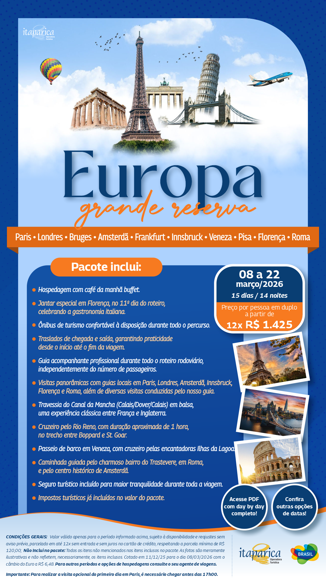 Cidades icônicas revelam diferentes faces da Europa em um percurso que une história, arte e paisagens marcantes. De Paris a Roma, passando por Londres, Amsterdã, Veneza e outras paradas especiais, os passeios guiados e a logística organizada permitem aproveitar cada momento com tranquilidade e conforto.