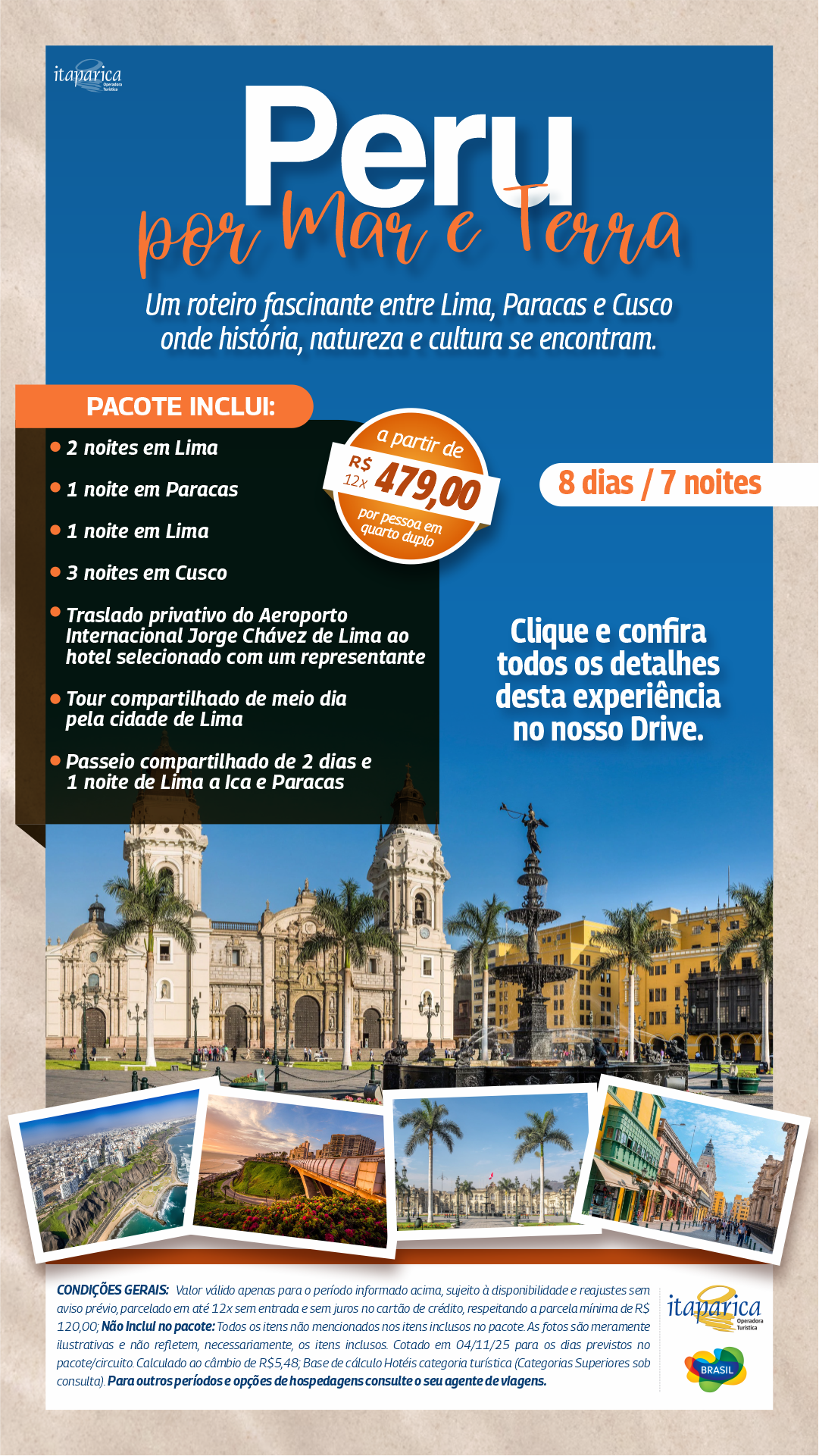 Um encontro perfeito entre mar, deserto e montanhas, revelando cenários que misturam história ancestral, cultura vibrante e a essência fascinante do Peru.