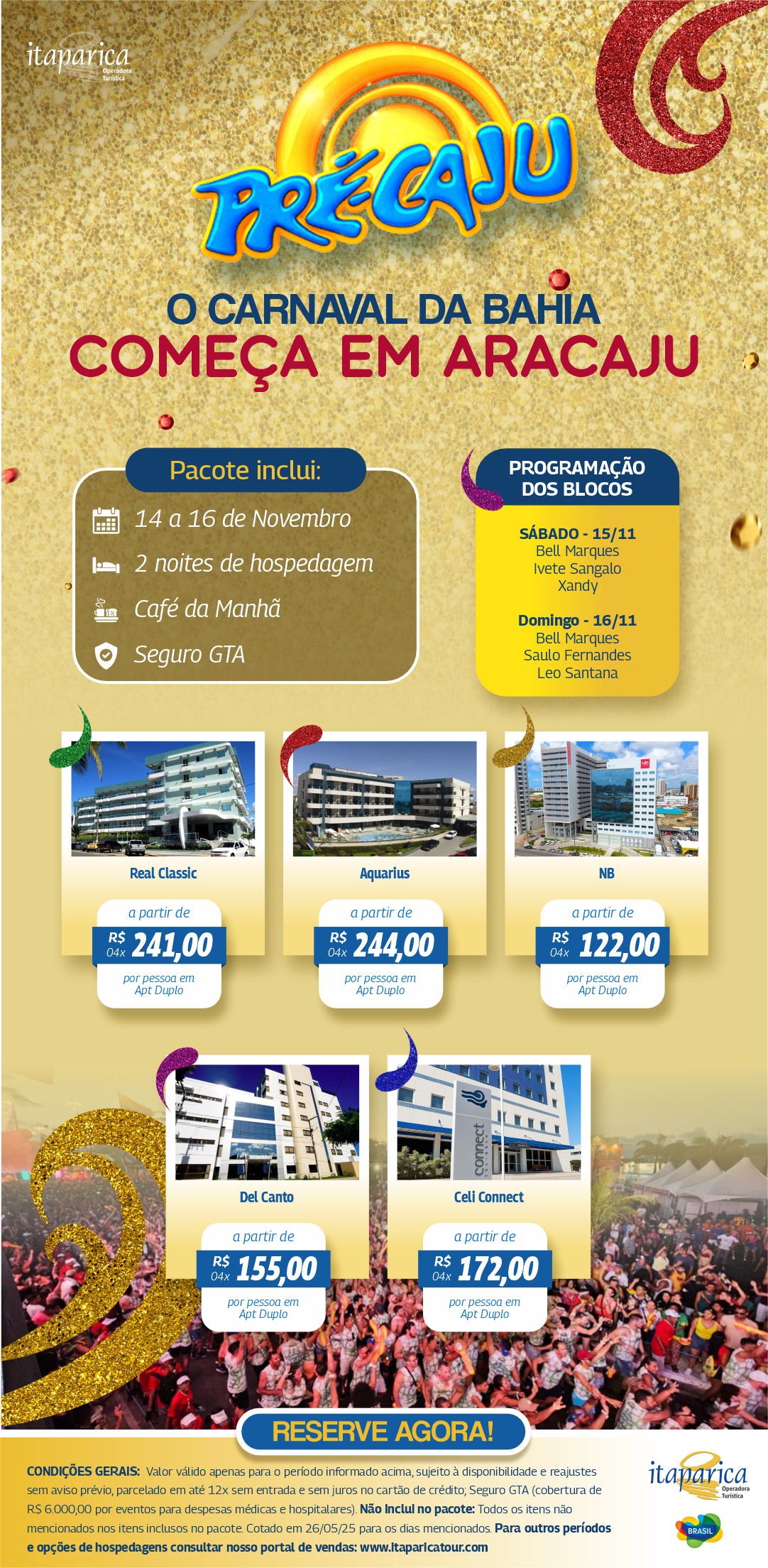 O Pré-Caju é a festa que abre alas para a folia, reunindo grandes nomes da música e uma energia contagiante que toma conta da cidade. Uma experiência única para viver a alegria baiana em um dos destinos mais acolhedores do Nordeste.