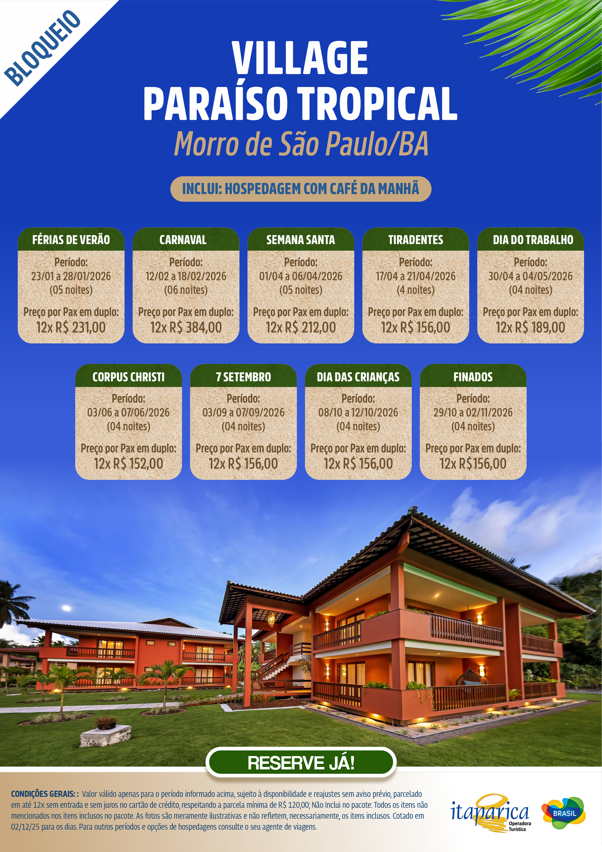 Entre coqueiros, mar cristalino e o ritmo tranquilo de Morro de São Paulo, o Village Paraíso Tropical convida a viver dias de descanso em um dos destinos mais encantadores do litoral baiano.